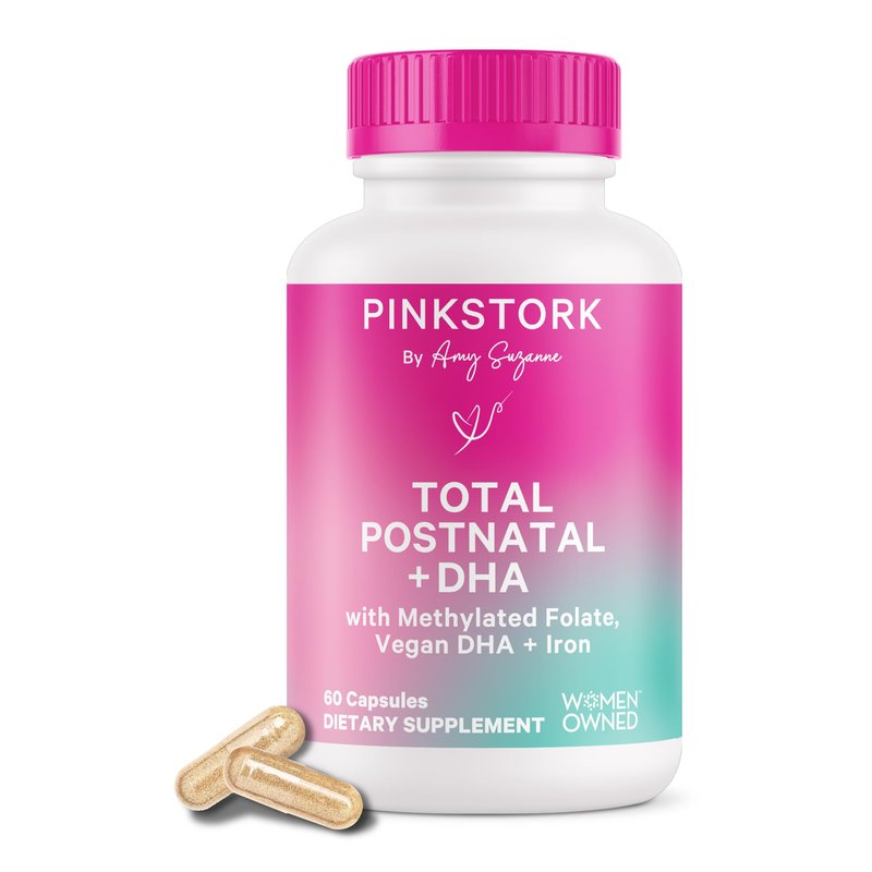 Pink Stork Total Postnatal Vitamins for Women with Vegan DHA, Iron, Folate, and Vitamin B12, Postpartum Recovery Essentials, Daily Supplement for Breastfeeding Moms - 1 Month Supply