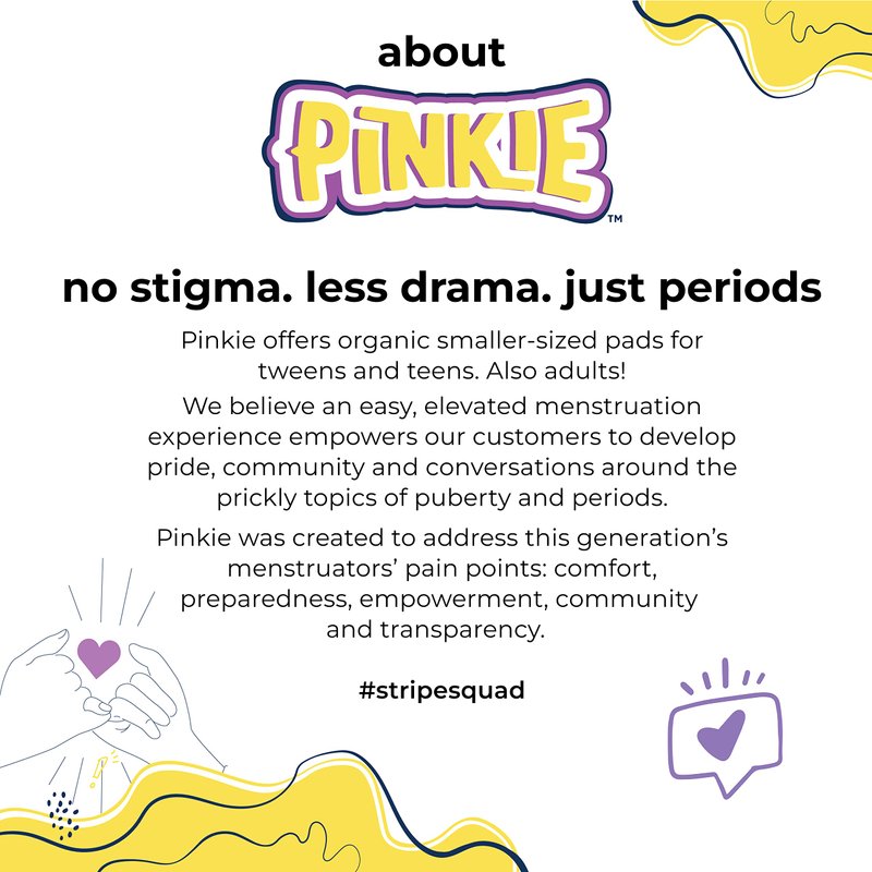 - ADDRESSES TEENS' BIGGEST NEEDS: Designed with leak-proof wings to keep liquid on the pad and off of underwear. Plus, each Pinkie natural pad comes enclosed in our patent-pending, slip-out, drawstring recyclable wrapper baggie. Cloth-like wrapper provides a better unwrapping experience and can be used for disposal of used pads