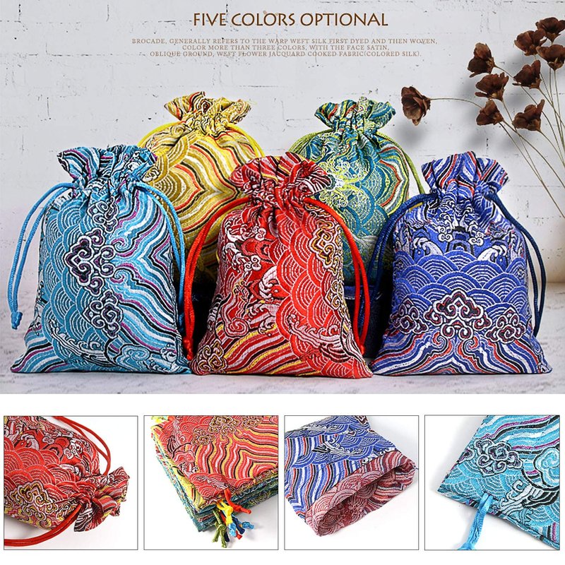 - [FASHION SILK BROCADE MATERIAL] - Beautiful premium embossed brocade silk fabric gift bags in sea wave flower designs, comes 5 colors, each color 2pcs, total 10pcs valued set, measurement: 10x14cm (4x5.5 inch).