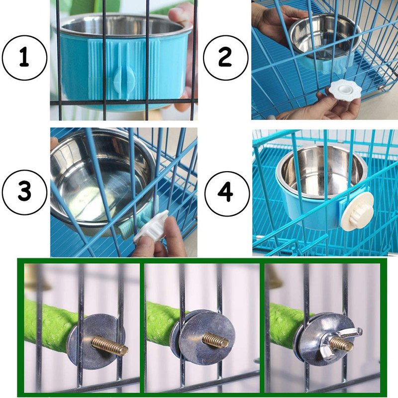 - 【EASY TO INSTALL】Food bowl installation: Remove the white plastic lock by turning counterclockwise, place the bowl in its proper place in the cage, then turn the white plastic lock clockwise and tighten it.The bird Standing perch comes with metal screws and gaskets,It is also easy to install and requires no other tools.