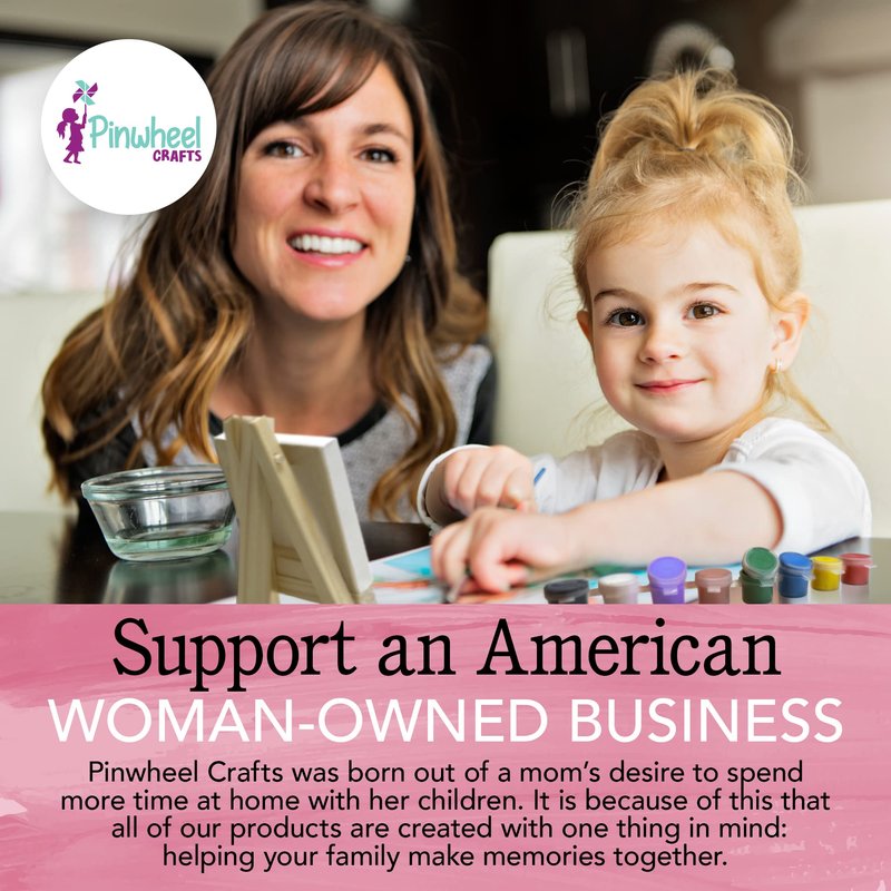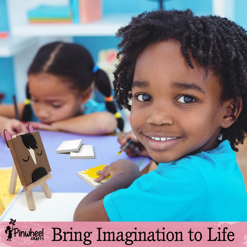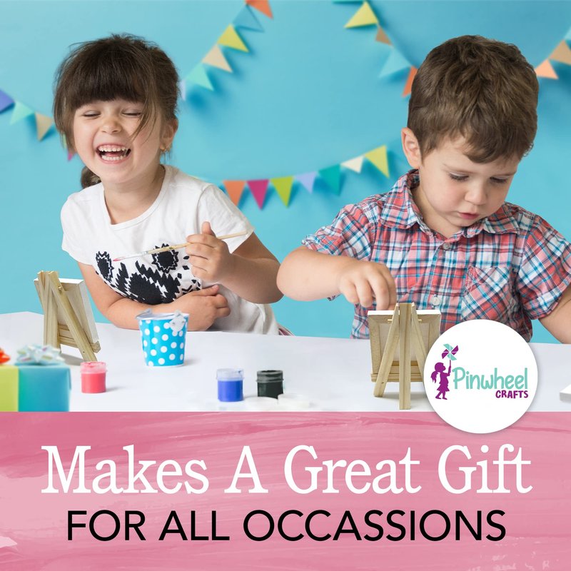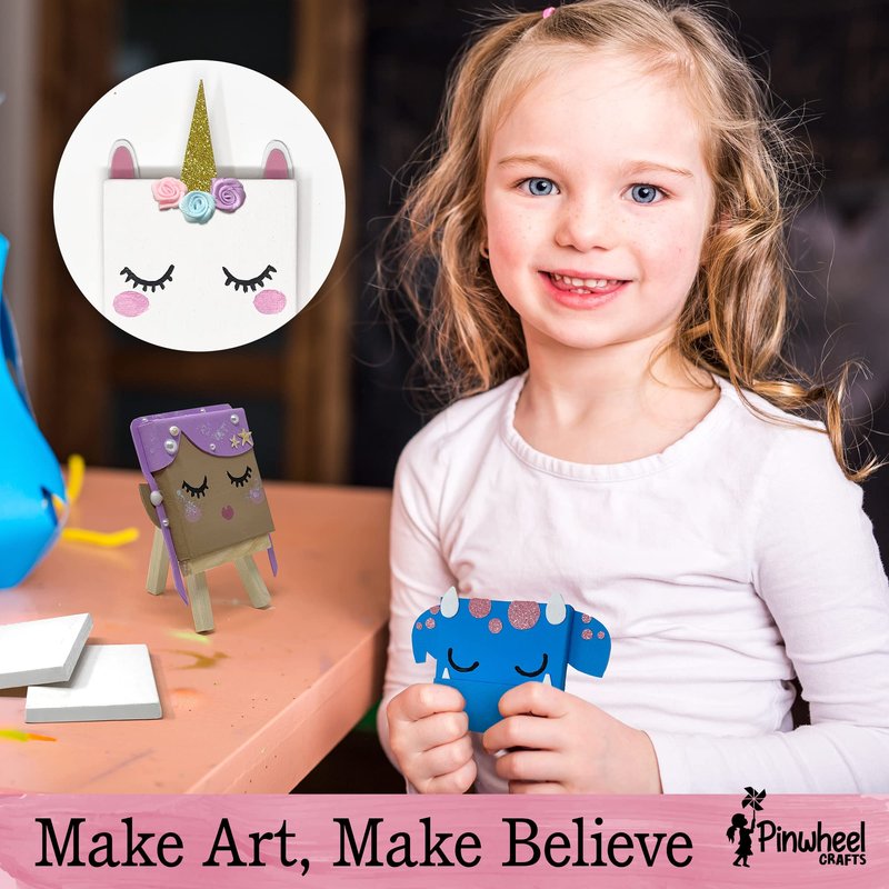 DIY kits by Pinwheel Crafts have a reputation for helping parents, grandparents, child psychologists and schoolteachers create stronger bonds with kids as they learn and grow. A woman-owned business inspired by the joy of togetherness, our company strives to provide crafty kids with all of the artsy supplies they need to unleash their creativity and let it flow freely. Put your little Picasso in control of his or her own creative direction with art supplies for artists of small stature! Carefully arranged to create engagement and excitement, this painting pack for kids contains everything needed for HOURS of entertainment in either a solo, paired off or group setting. When done painting, hang the tiny canvas murals on the wall, display them in the included easels as décor or give them as homemade gifts for grandma or grandpa. Display them on your desk, on art gallery walls, on shelves or on tables. You have tons of options! TIME TO GET CREATIVE Watch your child's imagination soar as he or she paints whatever pops into mind! Popular art subjects kids love to paint include unicorns, dinosaurs, fairy princesses, dragons, robots, superheroes, pets, sea creatures and zoo animals such as lions, tigers, bears, gators and much more. FOR INSIDE OR OUTSIDE Enjoy painting in the park, in the backyard or out at a nearby playground. Challenge kids to paint nature art by taking these painting packs outdoors. A great outside activity for kids, "plein air" painting outdoors is something the likes of Monet and other famous artists have used. FUN AND EDUCATIONAL Letting children experiment with painting supplies can help foster their artistic talents and strengthen fine motor skills. Just the right size to not be intimidating, our blank canvas panels allow kids to explore artistic expression, learn dexterity and build stronger connections with others. FOR PARTIES AND GIFTS Challenge kids to use the small canvases for painting pictures, portraits, monsters, rainbows and so much