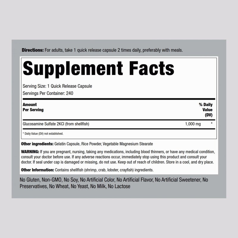 Piping Rock Glucosamine Sulfate is a scientific formula featuring 1,000 mg Glucosamine Sulfate 2KCI in quick-release capsules. It’s gluten-free, non-GMO, and quality tested to meet our unparalleled standards of purity and potency. Enjoy our Glucosamine supplement and get exceptional value with our 240-capsule supply!