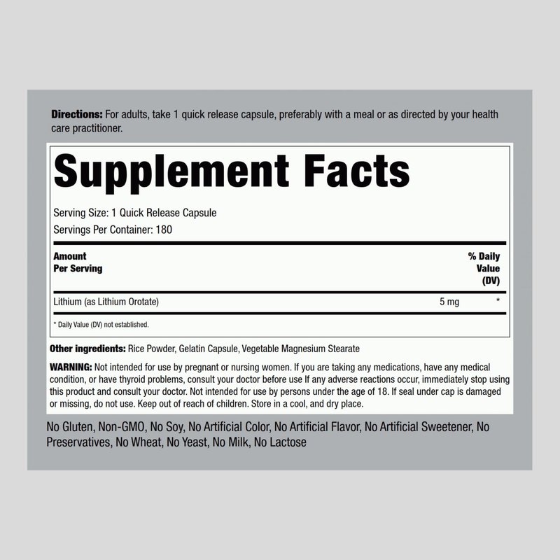 Many turn to Dietary Supplements for additional support. This version of Lithium binds lithium ions with orotic acid, rather than some other versions of Lithium supplements on the market. Our lithium orotate supplement brings to you 5 mg of this important nutrient in convenient, quick-release capsules!