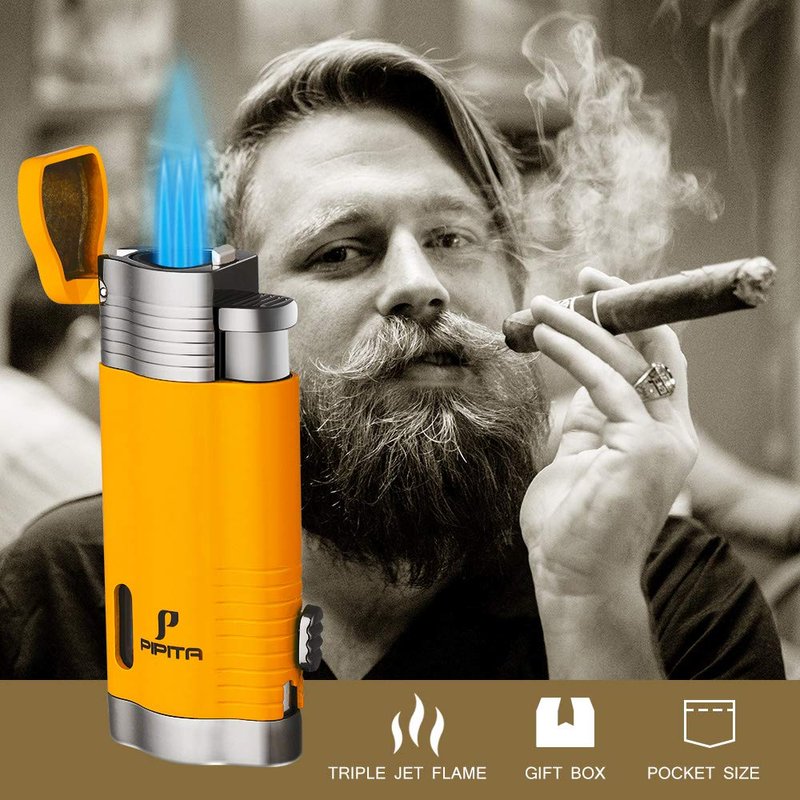 PIPITA Torch Lighter Windproof Cigar Lighter Triple Blue Flame Butane Gas Refillable Lighter Cigarette Lighter with Punch (Yellow)