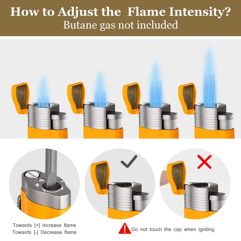 - { Safe & Easy to Use } : Sturdy Metal Material Body. Adjustable Flame Height . Refillable Butane Fuel . Lighter is shipped Without gas due to Air Mail regulation.