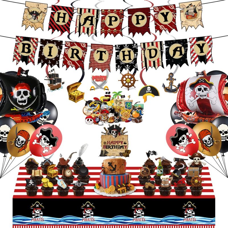 - ⚓103PCS PIRATE BIRTHDAY PARTY DECORATIONS - You can get 1 pirate happy birthday banner, 6 hanging swirls, 1 cake topper, 24 cupcake toppers, 50 stickers, 18 balloons, 2 pirate ship foil balloons and 1 table cover. This is a pirate-themed birthday party kit, which can fully meet the needs of children and bring happiness.