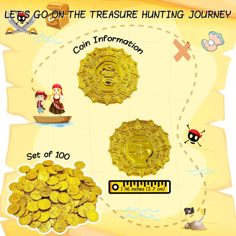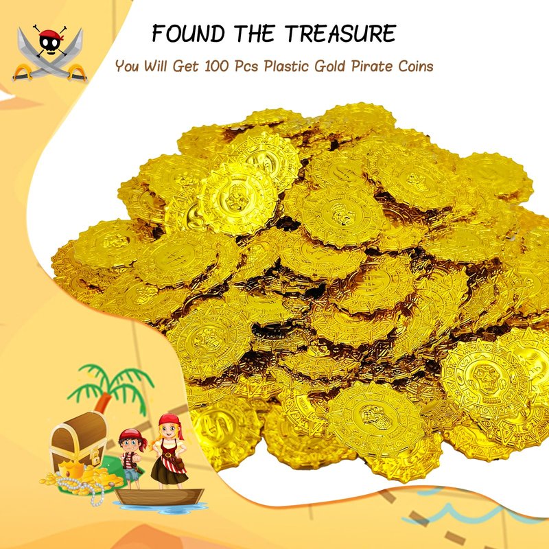 - What You Will Receive: Pack of 100 plastic gold pirate coins. Coins measures 1.38". gold color. Packed in transparent polybag. For ages 3 and up.