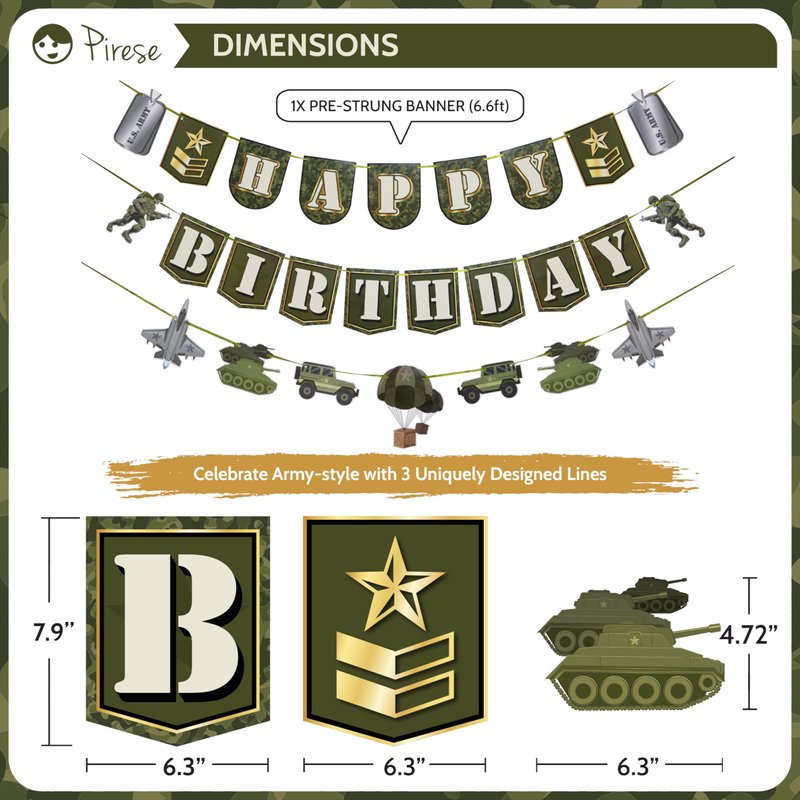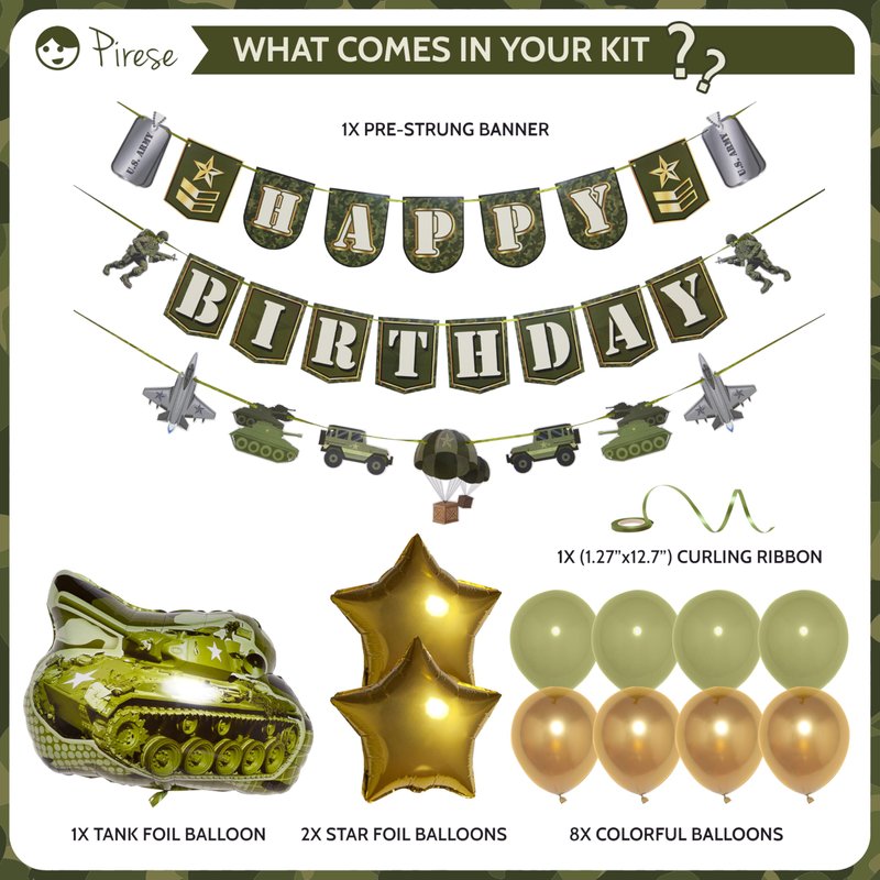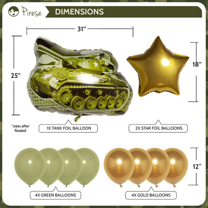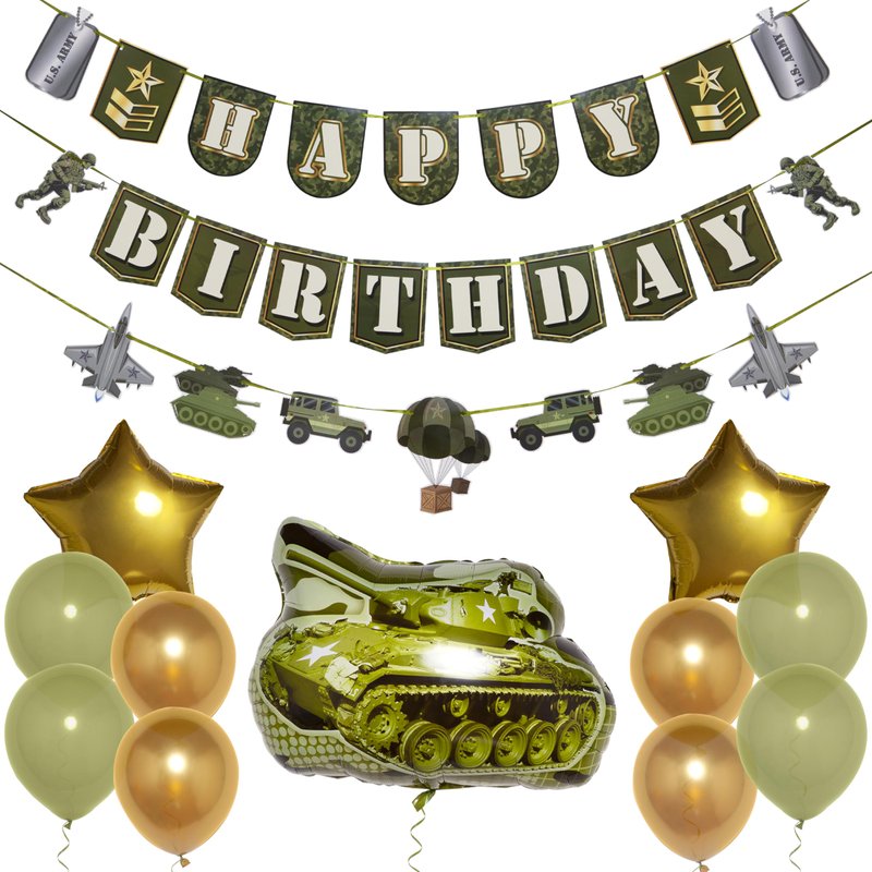 - MISSION: MEMORABLE BIRTHDAY: With our all-in-one set, camo decorations has never been easier, including 1x Army Happy Birthday Banner, 10x colorful balloons 12", 2x Star foil balloons 18" and a fearsome Tank Foil Balloon 30" ready for action!