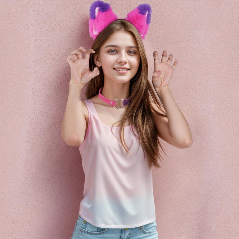 Pistha Furry Pink Purple Cat Ear Headband and Love Heart Leather Chocker for Halloween Animal Costumes Accessories