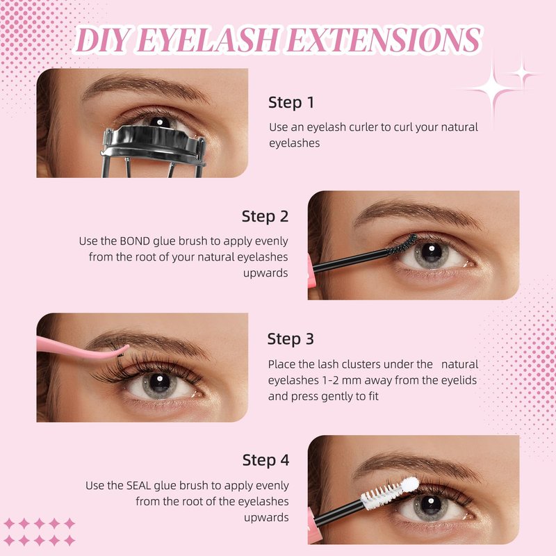 - EASY DIY EYELASH EXTENSIONS: When pasting cluster lashes, first take out the bond-end glue brush head, brush upward from the root of the real eyelashes and apply evenly, use flat-head tweezers to take out the false eyelash clusters and paste them on the corresponding eyelash roots, press gently to make them fit correctly , then take out the seal-end glue brush head, brush upward from the root of the eyelashes and apply it evenly. Even beginners can easily master it.