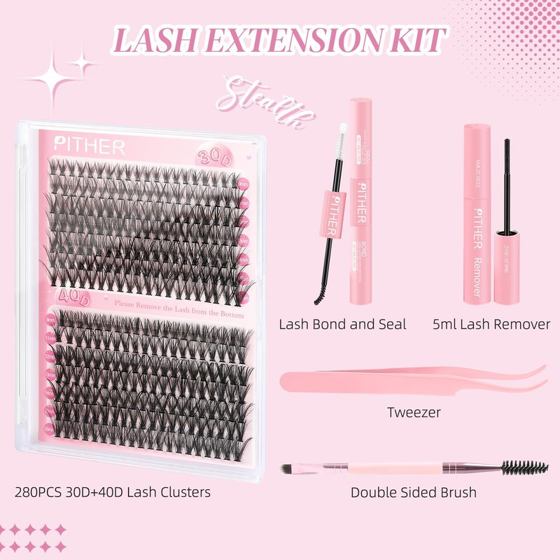 - LASH EXTENSION KIT FOR BEGINNERS: You will receive a lash clusters kit containing 280 pcs 30D+40D eyelash clusters, 8ml lash bond and seal 2-in-1 glue, 5ml lash remover for lash extensions, 1 flat-head tweezers, and 1 double-headed eyelash and eyebrow brush. The practical and easy-to-operate kit is beginner-friendly and a must-have tool for eyelash extension enthusiasts, making it easy to create beautiful lashes even at home.