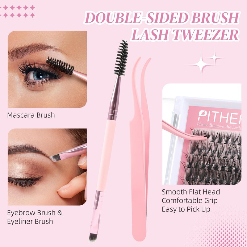 - โจใEasy DIY Eyelash Extensionsใ When pasting cluster lashes, first take out the bond-end glue brush head, brush upward from the root of the real eyelashes and apply evenly, use flat-head tweezers to take out the false eyelash clusters and paste them on the corresponding eyelash roots, press gently to make them fit correctly , then take out the seal-end glue brush head, brush upward from the root of the eyelashes and apply it evenly. Even beginners can easily master it.