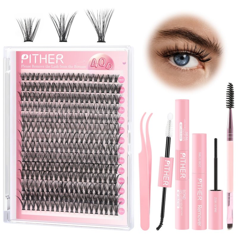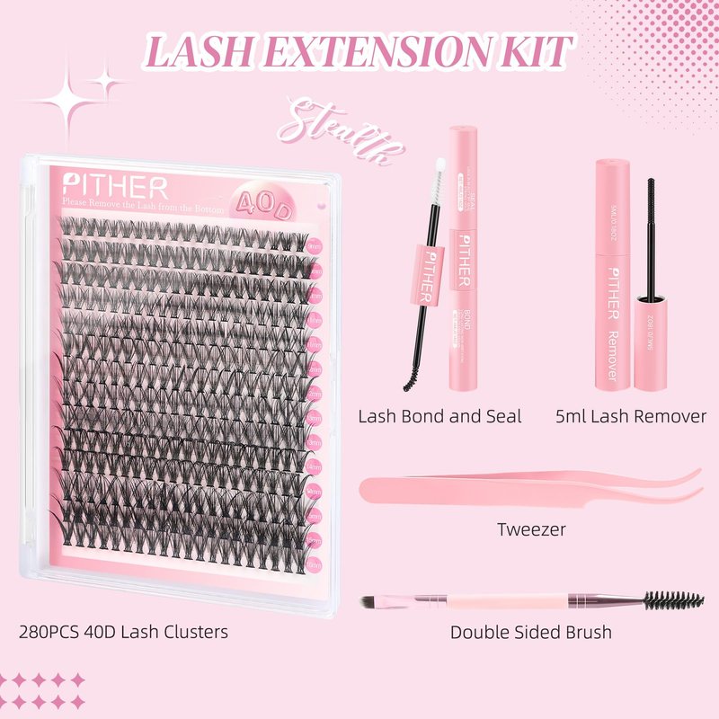 PITHER DIY Lash Extension Kit, Eyelash Extension Kit 280PCS 40D Mix 9-16mm Individual Lash Clusters Kit with Applicator Bond and Seal Lash Glue Lash Extension Remover Tweezer