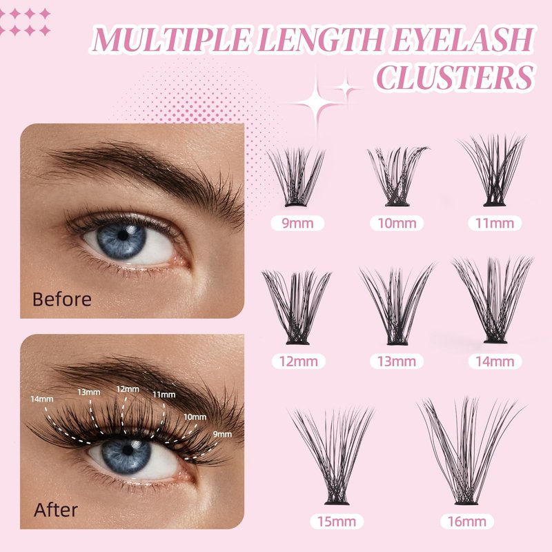 - ✨【D Curl Lash Clusters 9-16MM Available】 The cluster eyelash extensions set contains a variety of 𝟗-𝟏𝟔𝐦𝐦 lengths to adapt to different eye contour needs. You can choose different length combinations according to your preferences to create a natural and personalized eyelash makeup effect.