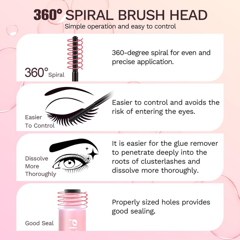 - SPIRAL BRUSH HEAD: The lash glue remover adopts a convenient spiral brush head design, which is simple to operate and easy to control. It can effectively prevent the glue remover from slipping into the eyes and is friendly to beginners.