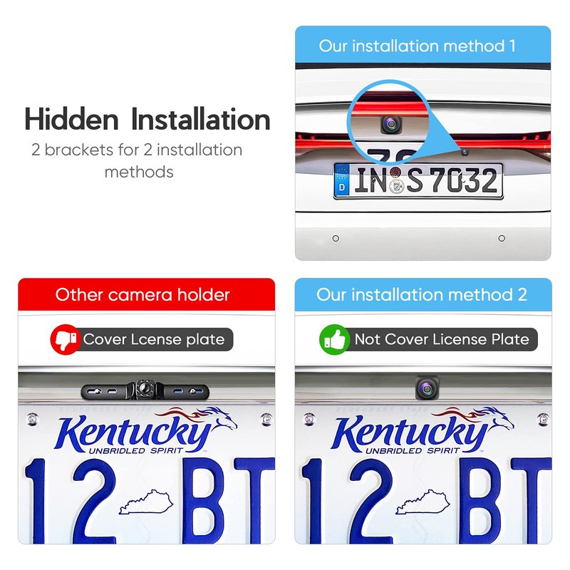 - 【Perfect Installation】The PixelMan PMD2A-S auto back up camera has 2 mounting brackets which support 2 mounting options. The sturdy bracket makes the reverse camera stay stable after installation. The license plate bracket can be installed on the back of license plate without drilling holes in the car body, only the camera part is exposed after installing, which achieves the hidden installation. With the newly designed Mini alloy housing, it is very beautiful after installation.