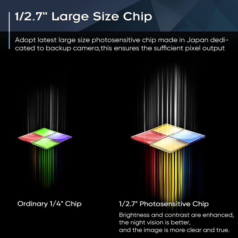 - 【1/2.7in AHD 1080P Large Chip Adopted in This Reverse Cam】The chip size determines the amount of reversing camera output pixels, compared with 1/4in chip used in ordinary backup cam, the most apparent feature is the enhanced brightness and color saturation besides of the sufficient clarity. The colors become more vivid and true, the increased brightness makes the images more clearly, meanwhile, the night vision effect also be enhanced, you can back the car easily without extra light at night.