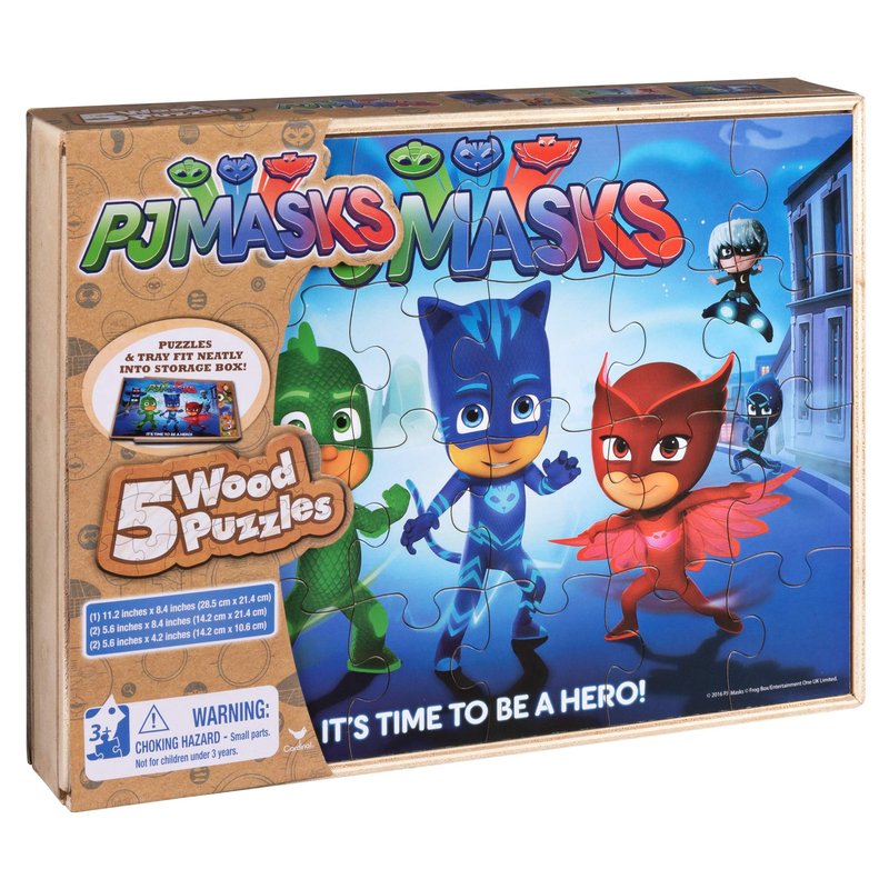 - 5 PJ Masks wood puzzles in 1 handy wood storage box – a great gift for your favorite PJ Masks fan!