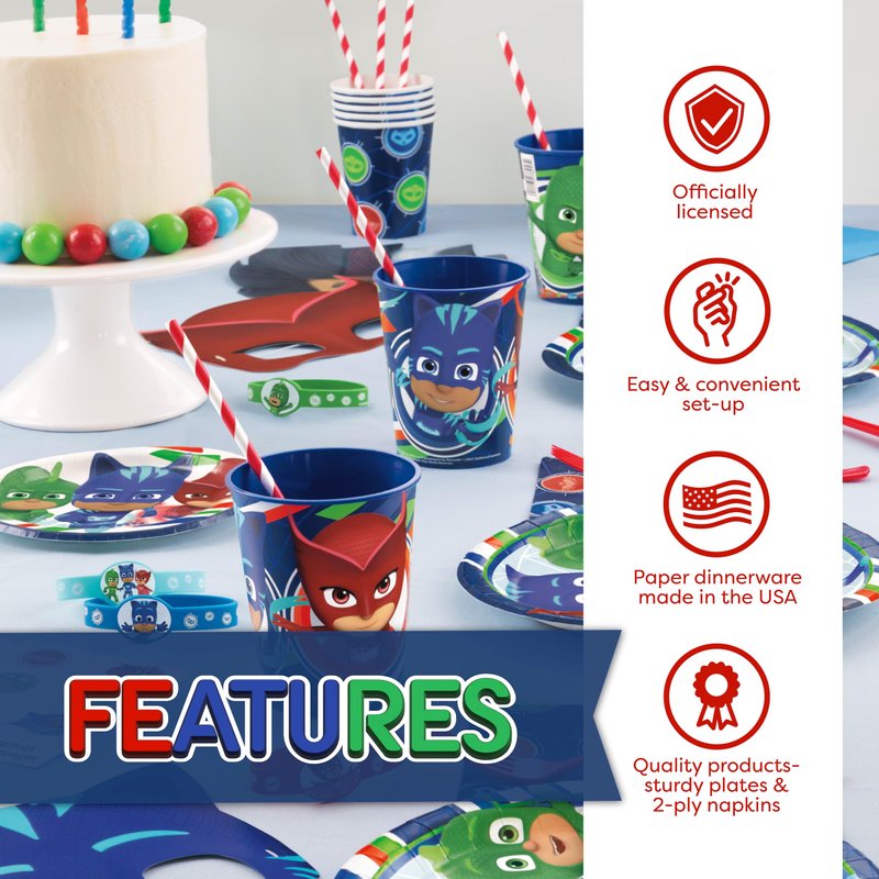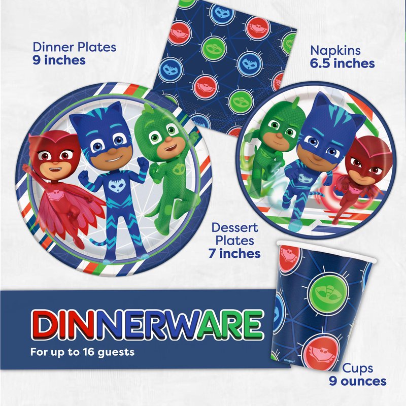 - This set includes enough PJ Masks party supplies to host a party of up to 16 guests: 1 table cover, 16 large 9" paper serving plates, 16 small 7" paper plates, 16 paper napkins, 16 cups, and 1 It's My Birthday! button.