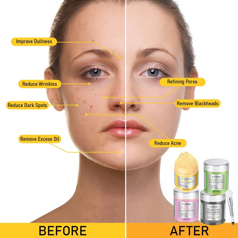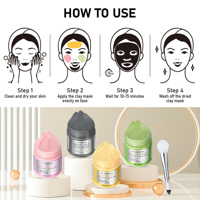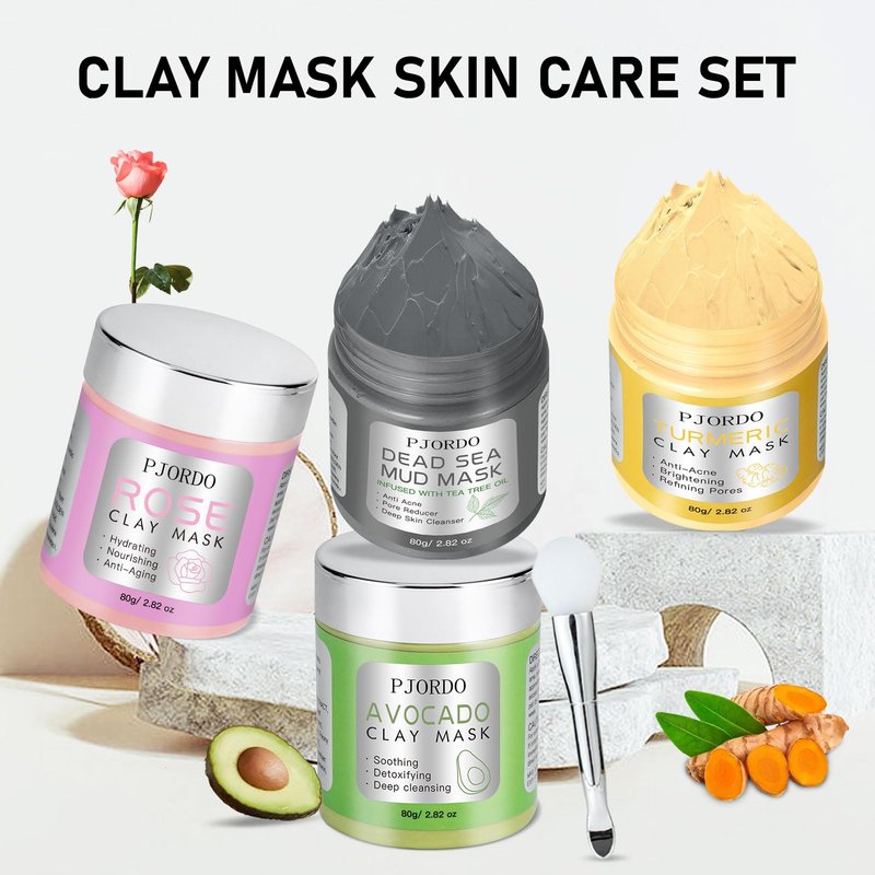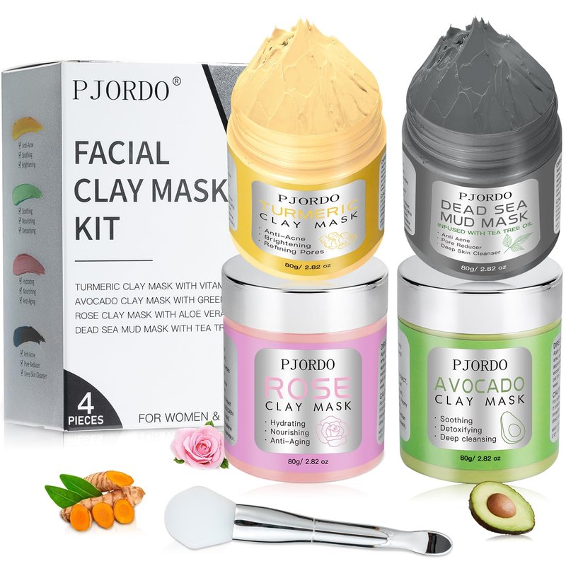 Pjordo 4 Pcs Clay Mask Set, Turmeric Vitamin C Clay Mask, Dead Sea Mud Mask, Avocado Clay Mask, Rose Clay Mask, Face Mask Skin Care Set, Perfect Gifts For Women Girls, 2.82 Oz Each