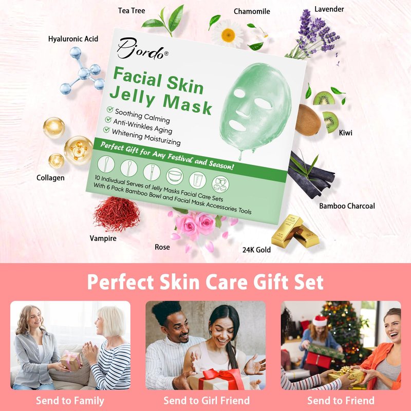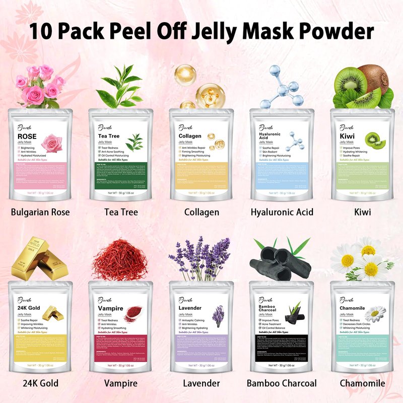 - 10 Flavors Jelly Mask Powder: Rose, Vampire, Lavender, Hyaluronic Acid, Bamboo Charcoal, Collagen, Kiwi, 24k Gold, Tea Tree, Chamomile. Each flavor of peel off jelly mask has different skincare benefits. Comes with complete face mask mixing tool kit, enjoy a professional jelly facial mask skin care spa treatment at home!