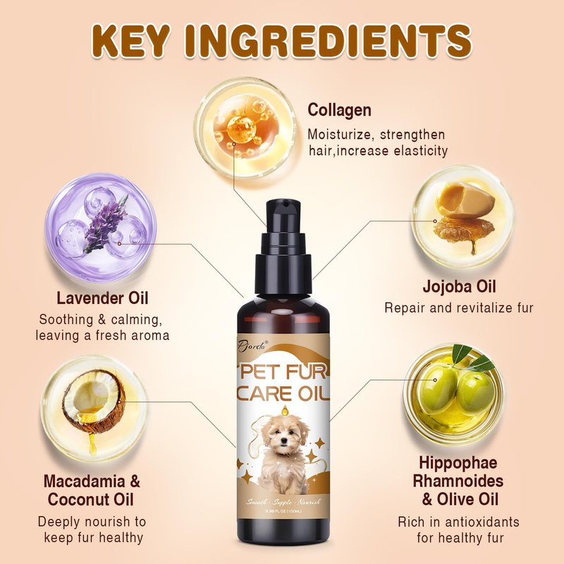 - Natural Nourishment & Repair: Our pet fur care oil is enriched with collagen, jojoba oil, olive oil and other high-quality natural oils. It deeply penetrates every hair strand, providing long-lasting moisture and nutrients to gently condition your pet's fur while helping strengthen and repair the coat.