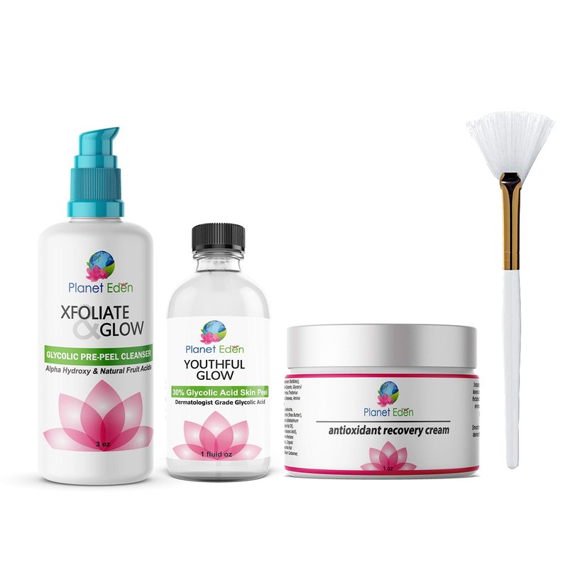 Planet Eden 30% Glycolic Acid Chemical Skin Peel Kit + Glycolic Acid Pre-Peel Cleanser + Antioxidant Recovery Cream + Treatment Fan Brush