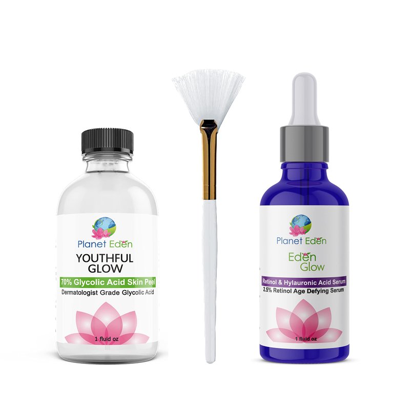 Planet Eden's Glycolic Acid Peel diminishes fine lines and wrinkles over time with consistent use. Reduces the appearance of brown marks/age spots Planet Eden Retinol and Hyaluronic Serum has the strongest amount of retinol allowed. Retinol and Hyaluronic Serum is a nightly, anti-aging serum that minimizes fine lines and deep wrinkles, firms, evens skin tone and boosts radiance to give you a more vibrant, youthful complexion. 70% Glycolic Acid Skin Peel is ideal for advanced peel users or those with very oily/resistant skin YOU WILL NEED A SKIN PEEL NEUTRALIZER TO STOP THE SKIN PEEL.