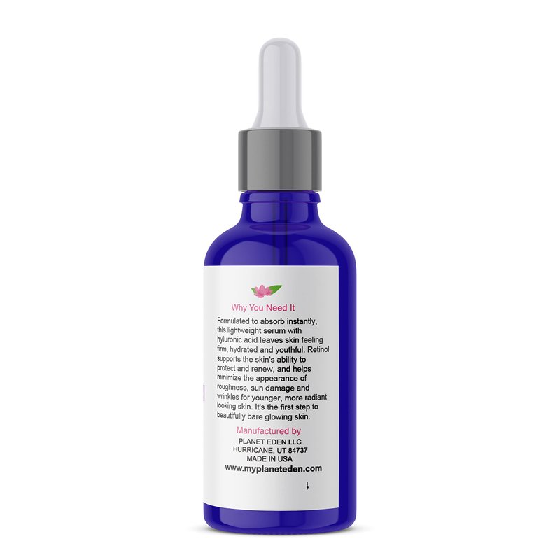 Planet Eden's 2.5% Retinol and Hyaluronic Acid Serum improves skin tone and texture, helps reduce fine lines and wrinkles and leaves skin with a vibrant and healthy complexion.