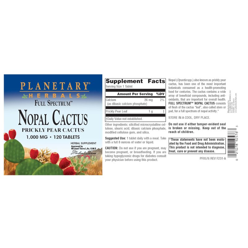 Planetary Herbals Full Spectrum Nopal Cactus, Prickly Pear Cactus, 1000 mg, with Prickley Pear Leaf - 120 Tablets