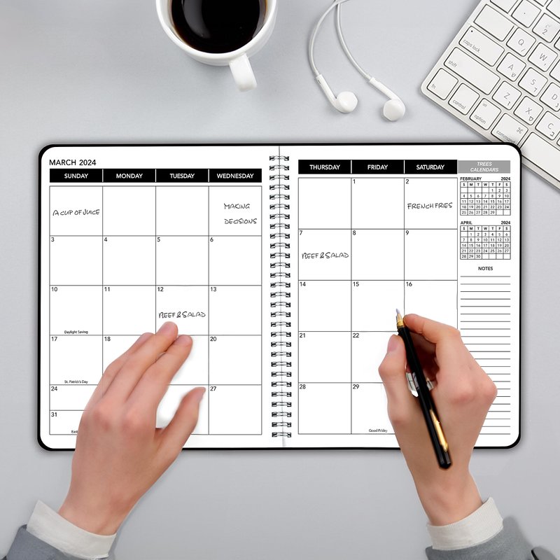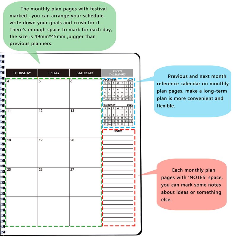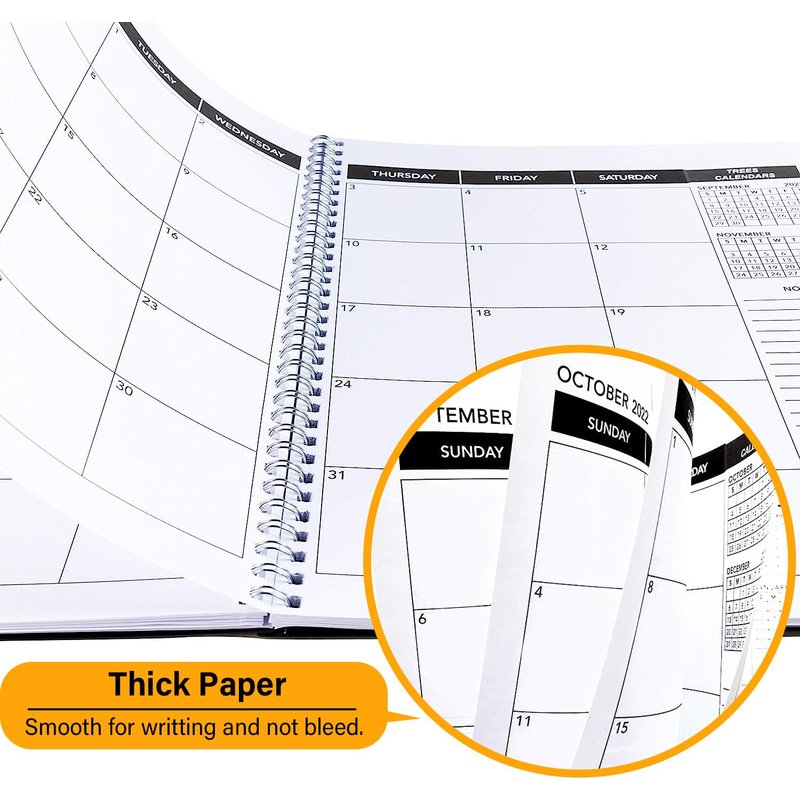 - THICK PAPER - Prevents bleed-through with markers. Each pages has MINI CALENDARS for all months. We choose easy design for making notes for dairy,weekly and monthly,you can see all schedules easily and clearly.It have a calendar portion and then a place where you can write out your days in the month. It's simple, but it will get you through the year.