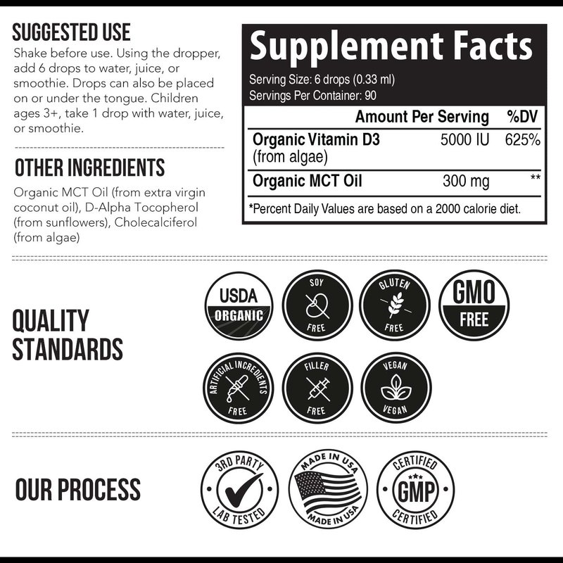 - VEGAN D3, USDA ORGANIC CERTIFIED, 3RD PARTY TESTED: Plant-D3 is organically certified by the USDA and exceeds all vegan standards. It is GMO-free, soy-free, gluten-free, preservative-free, additive-free. It is produced in a cGMP & organic certified facility in the USA and is 3rd party tested for over 100+ toxins or microbials.