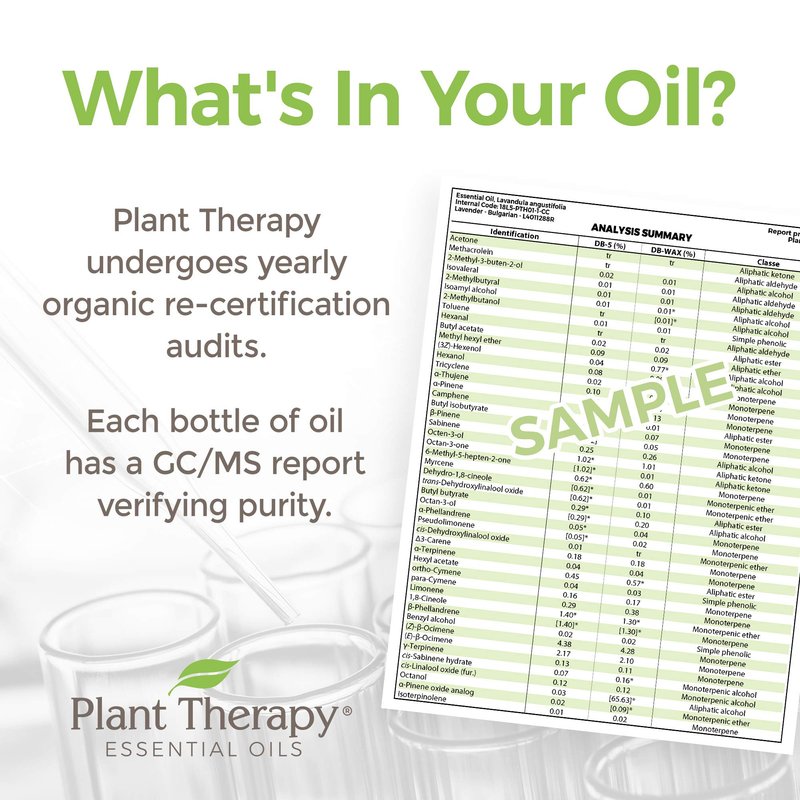 - BATCH SPECIFIC GC-MS REPORTS ON EVERY OIL: Every bottle of oil from Plant Therapy goes through multiple rounds of testing including organoleptic and multiple rounds of GC-MS testing by a third-party laboratory.