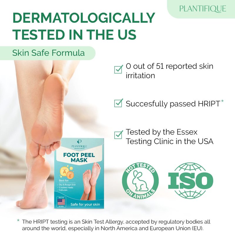- DERMA TESTED: The quality and safety of the foot mask is guaranteed by the Essex Testing Clinic established in 1983. Our dermatologists created this foot exfoliator peeling mask formula without any harsh or harmful ingredients, such as parabens or lanolin.