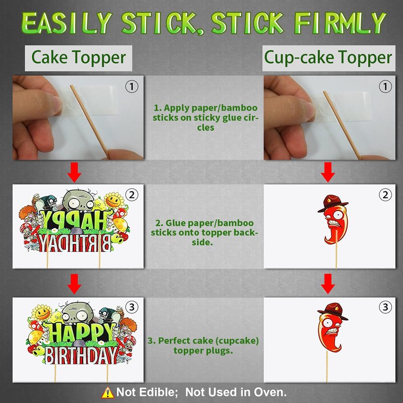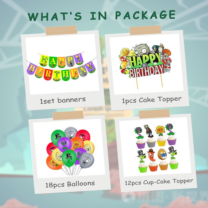 - What You Get:1 pcs pvz birthday banners, 12 pcs cupcake toppers, 1 pcs cake toppers, 18 pcs Zombies balloons; after-sale return guarantee if not satisfy