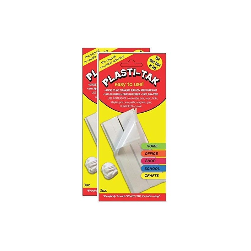 - Includes (2) of The Original Reusable Plasti-Tak Adhesive Putty, 3oz. "The Duct Tape of Tak." This sticky adhesive can be used hundreds of times, and for long periods of time without it drying out or losing its adhesive properties.