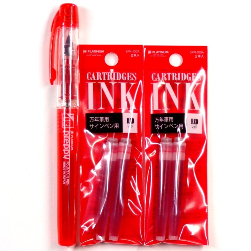 Ink Cartridges: 2 cartridges ×2 Packs/total 4 cartridges. Mechanism: Cartridge only. Water-based ink . Ink Color : Red. It is an authentic fountain pen of the cartridge-type which attached the alloy to the nib. The alloy of a nib reduces friction with paper and realizes a smooth feel of writing. Nib: Stainless. Character width: F (fine).