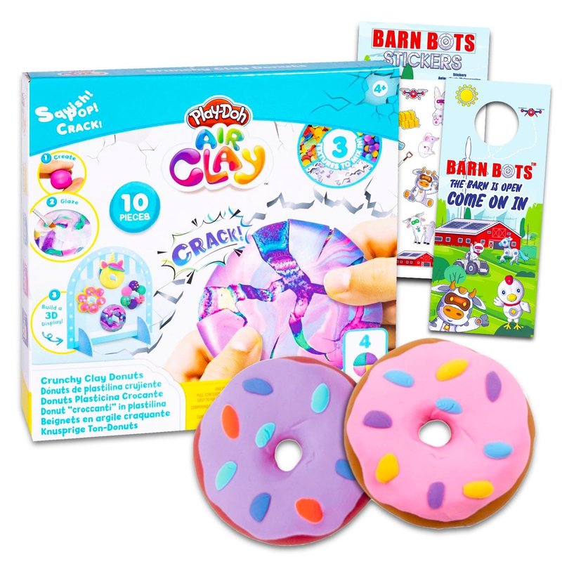 Play-Doh Air Dry Clay Craft Kit for Kids - Bundle with Play-Doh Crunchy Clay Donut Activity Set with Glaze, Clay Add-Ins, Stickers, More | Play-Doh Activity Set for Boys, Girls. This Play-Doh arts and craft kit includes everything your little one needs to creat their very own crunchy clay donuts. Use the clay to assemble your donut, glaze the donut with the special crunchy glaze and crack your donuts for a satisfying activity! This Play-Doh clay activity set is the perfect sensory playset to teaching fine motor skills and color recognition while sculpting your own tasty treats. Officially licensed Play-Doh Crunchy Clay Donuts craft kit for kids also includes Barn Bots stickers and a Barn Bots door hanger.
