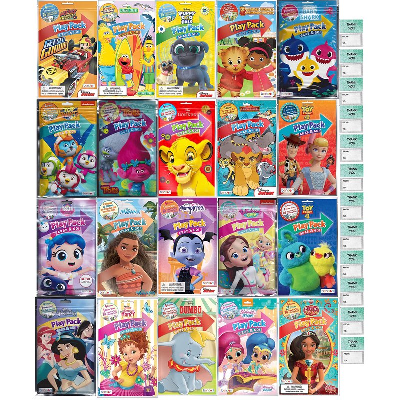 - Bundle Includes 12 DIFFERENT Play Pack GUARANTEE. Each Play Pack has 4 Crayons, 25 Stickers, a 24 Pages Fun Sized Coloring Book (4” x 6.5" each play pack).