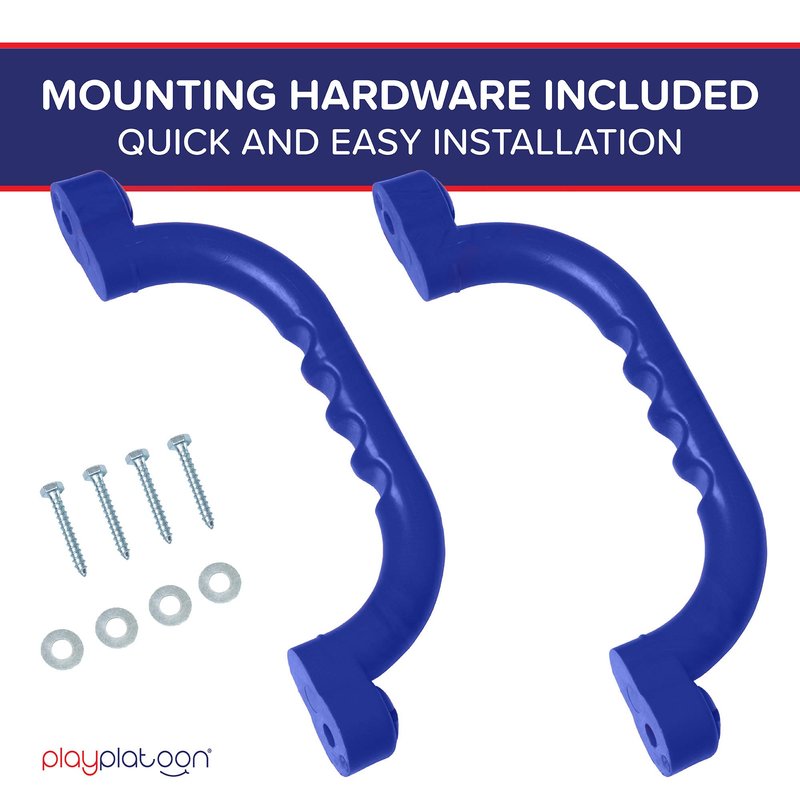 Playground handles help keep kids safe as they play, climb, and get great exercise! Includes free hardware for fast installation. Heavy duty material and a strong, durable design ensure these playground handle bars will last you and your family for years. These playground grab handles meet or exceed all ASTM safety standards. Includes two blue safety handles, four screw covers, and hardware.