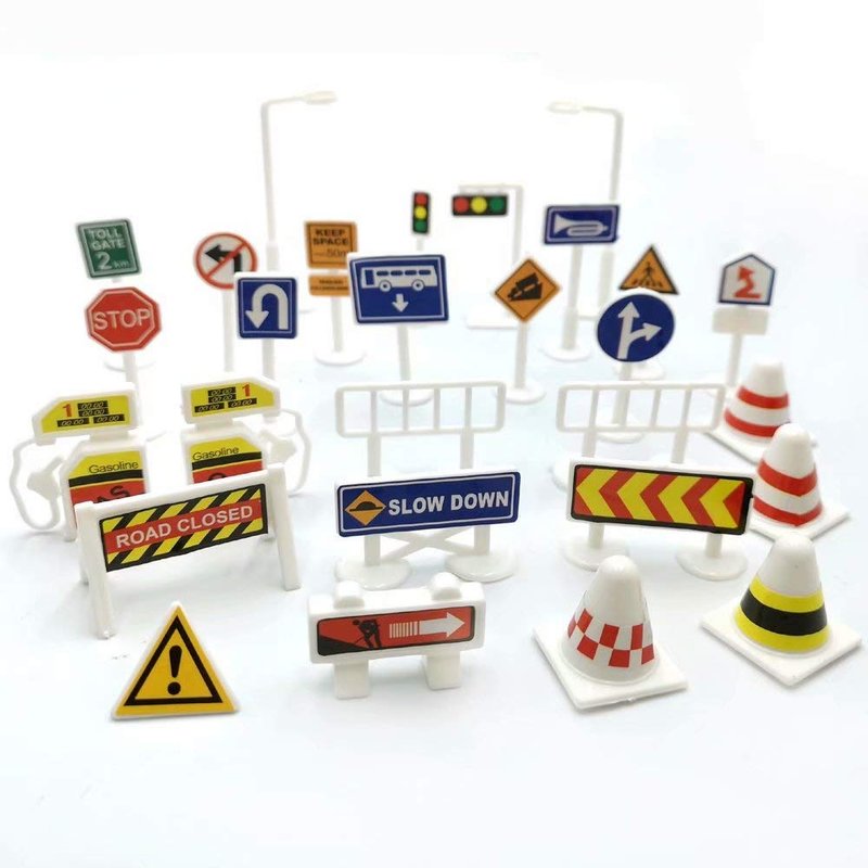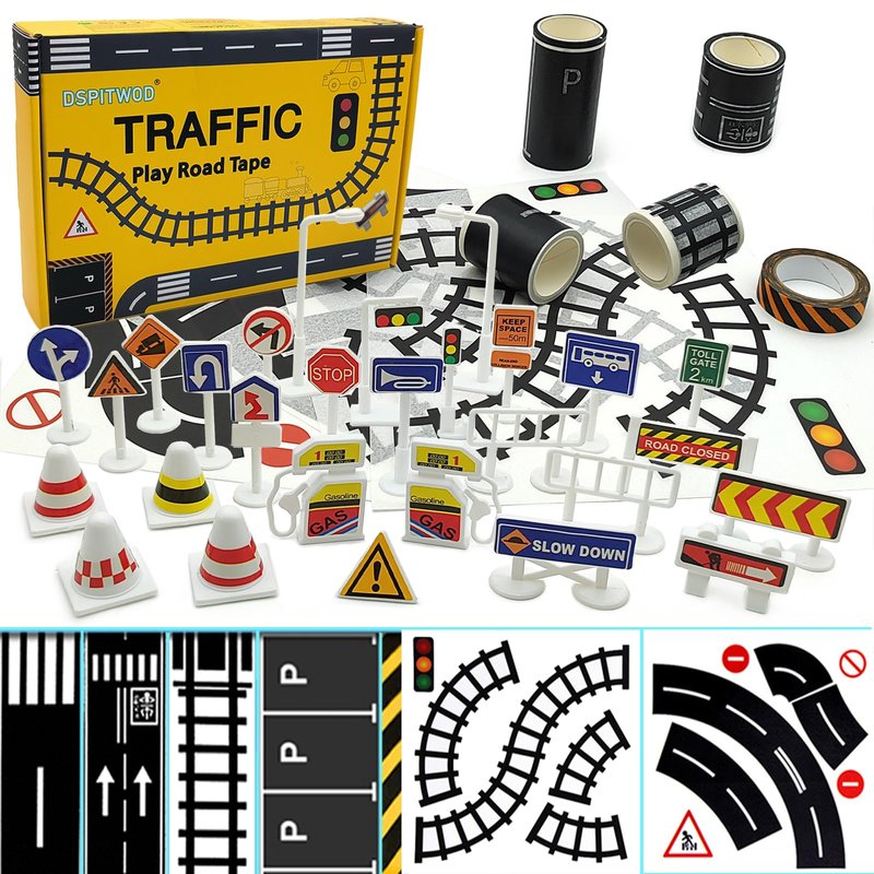 1).3 rolls road tape track(1.9" x 197") +1 roll warning tape (0.59 x 394") + 1 roll park tape (3" x 118")+ 4 curves track tape+1 set Traffic signs.