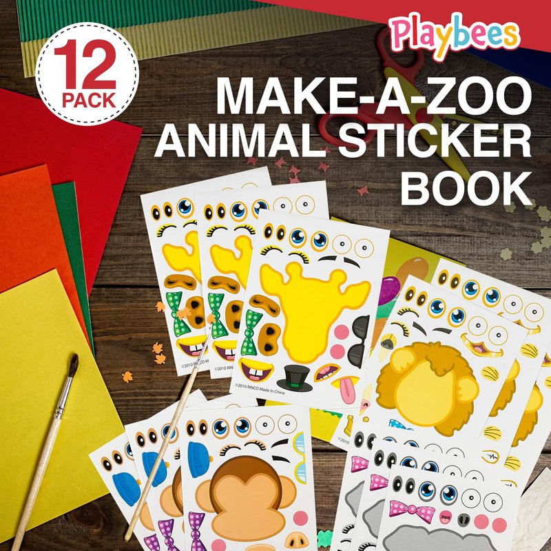 Playbees Make A Zoo Animal Stickers - 12 Pack - Zoo and Safari Themed Birthday Party Favors - Fun Craft Project for Children 3+ - Let Your Kids Get Creative & Design Animal Stickers