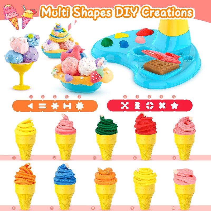 - DIY Playdough Set Toys:This ice cream maker toy set comes with eight cans colorful playdough,which have six basic color and can be blended into different colors according to the color chart on the manual, kids can make all kinds of ice cream as they like, package includes everything they need to enjoy DIY entertainment