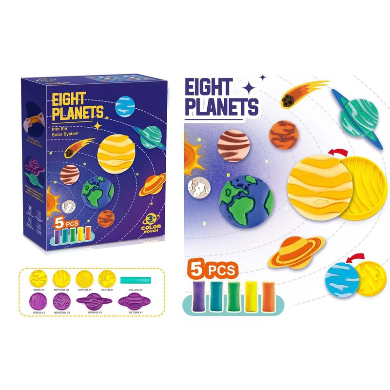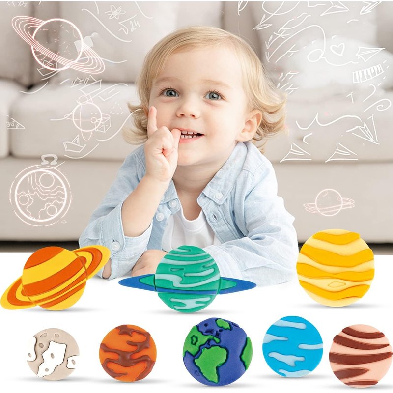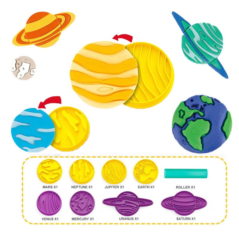 - 【PLAYDOUGH SET】This Dough toys come with a small package for simple storage. 5 doughs and 1 rolling pin and 8 planets shape makers.