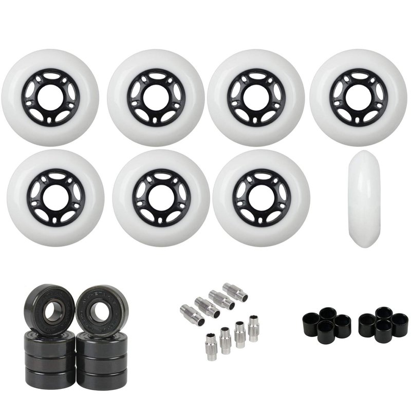 - Includes 8 80mm Wheels, 16 Hybid Ceramic Bearings, 8 8mm Spacers, and 8 6mm Stepped Spacers (You only need 1 set of spacers depending on your skates, we inclue both as a courtesy).