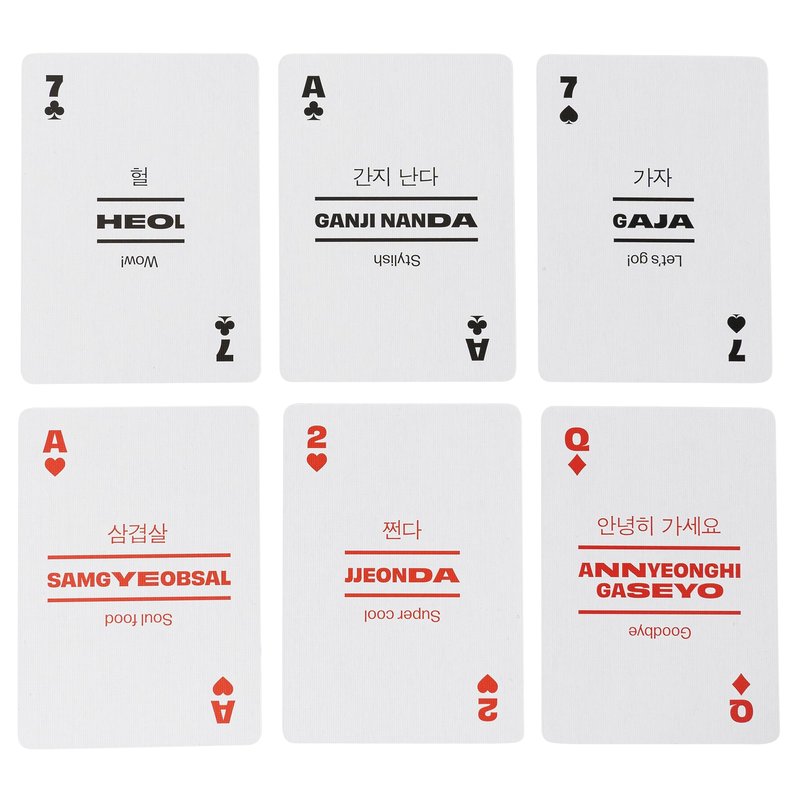 - STANDARD PLAY DECK - Each deck of cards has 54 of the most useful phrases to know in Korea, complete with phonetic pronunciations, and features a conventional deck of 52 playing cards and two jokers. These flash cards provide an introduction to popular Korean lingo and are ideal for language learners just starting out.