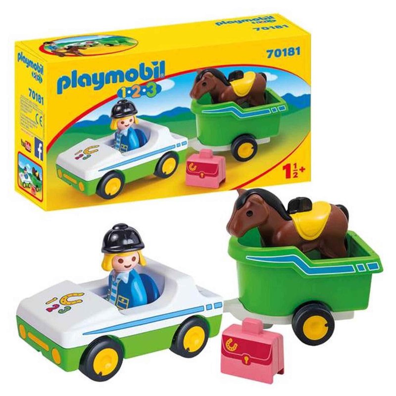 - Hit the road for an adventure with the Car with Horse Trailer. With a bright and colorful design and large, rounded pieces, this PLAYMOBIL 1.2.3 set is ideal for toddlers