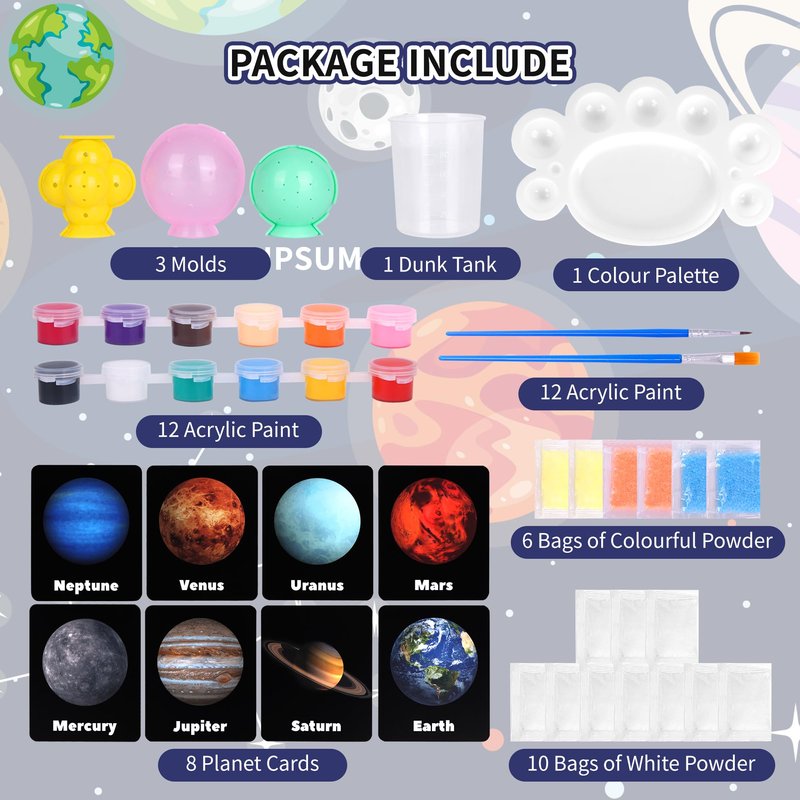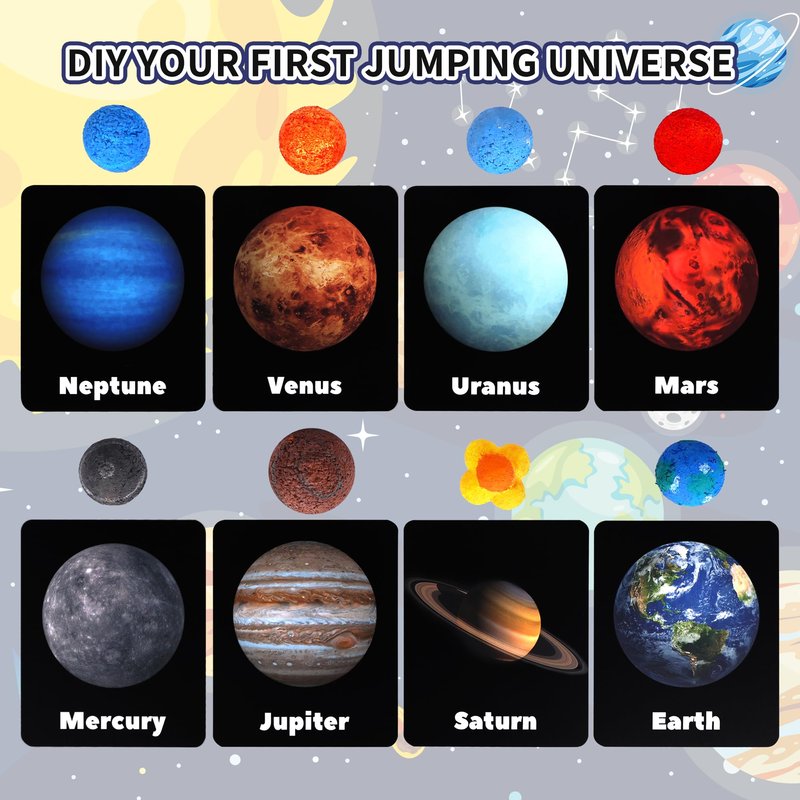 - Make Your Own Bouncy Ball Kit: Dive into the wonders of space with our DIY solar system bouncy ball Kit. Craft 8 unique planet balls, including Earth, Mars, Saturn, Mercury, Venus, Uranus, Jupiter,Neptune , using 3 distinct mold shapes.