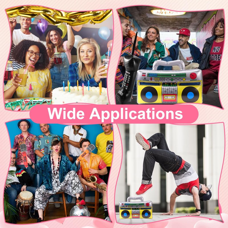 - 80s 90s Party Decorations: Package includes 1 inflatable boom box, 1 inflatable phone, 2 inflatable microphones, 1 inflatable glasses, 20 gold chain balloons. This combination can easily meet your theme parties decoration needs, and brings you much fun in the party.