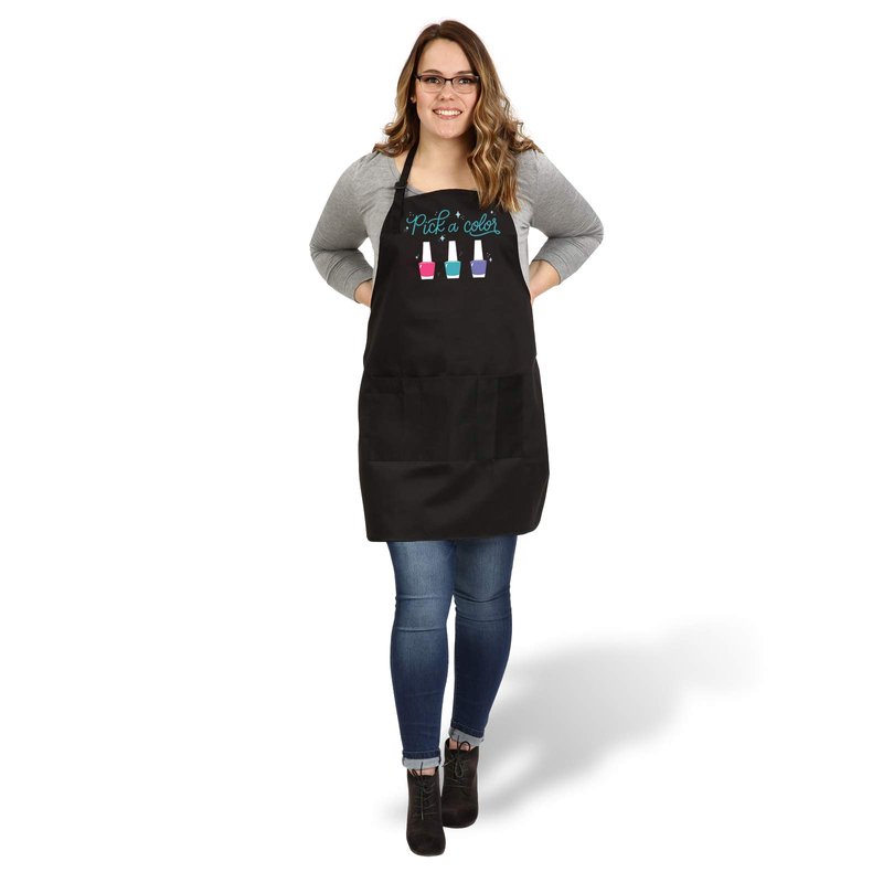 - ADD A POP OF COLOR TO YOUR SALON This apron has bright colors of white, teal, pink, and purple to show a variety of colors for a fun design. Encourage your clients to pick a color with this apron. Add it to your collection of nail kit supplies for your station or salon.